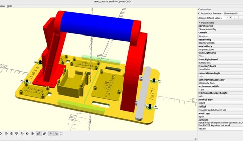 DonKCar is an autonomous racer, built upon commercial RC car chassis. This project includes an OpenSCAD tool that allows you to design custom upper plates to fit upon common chassis, utilizing Raspberry Pi, Jetson Nano, or Arduino shield based controllers and either OpenMV or RPi flavored cameras.