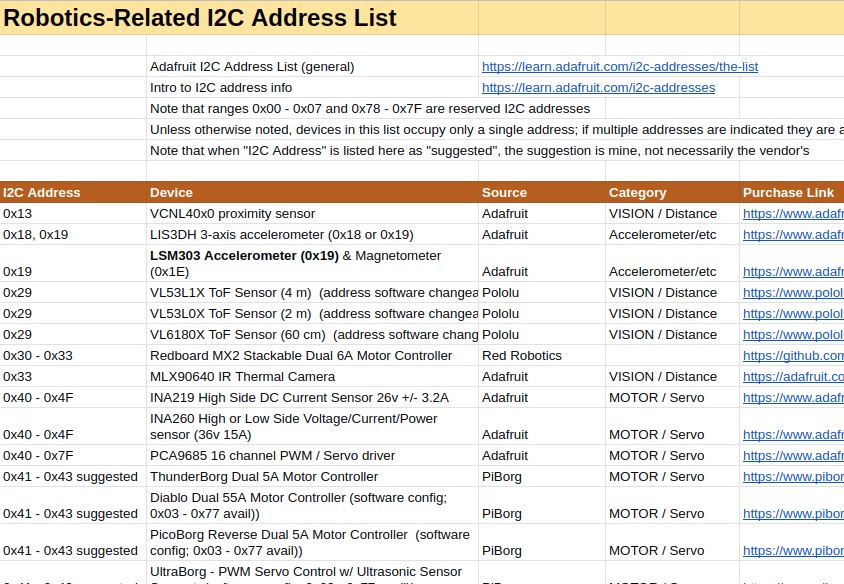 This is a short list of I2C addresses for boards / sensors / drivers that are commonly used in robotics projects. It includes devices from Adafruit, Pololu, Sparkfun, Red Robotics, PiBorg, DF Robots, and others.