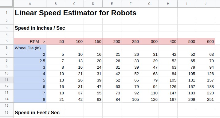 This spreadsheet shows estimated forward speed for robots based on wheel diameter and motor speed in RPM (metric and imperial units)