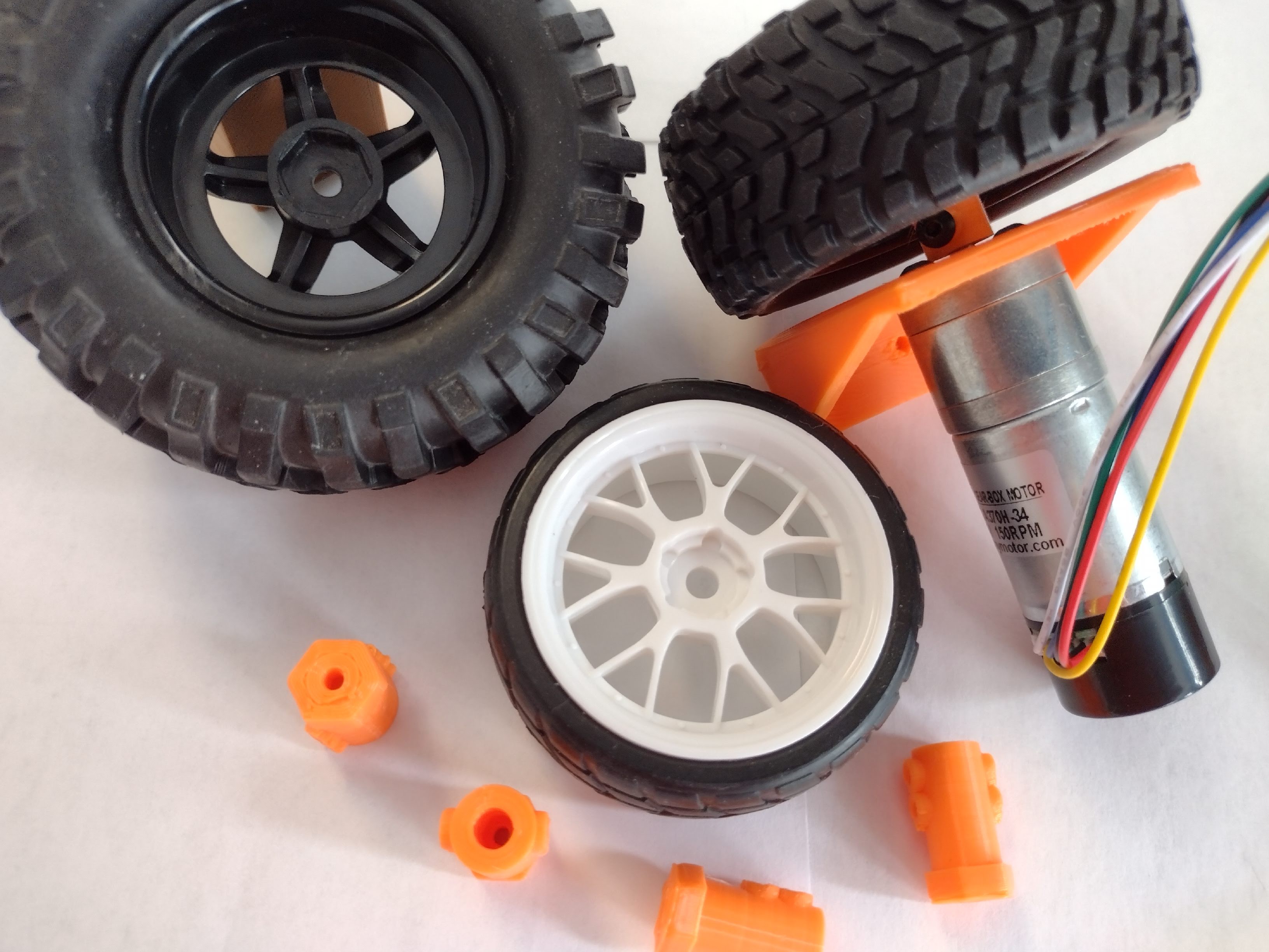 Your robot can use readily available RC car/truck wheels in a variety of styles/sizes. Most of them use standard 12mm hex nut hubs for attachment. Use this OpenSCAD tool to generate 3d-printable adaptors to use these wheels with 4mm, 5mm, 6mm, or TT motors.